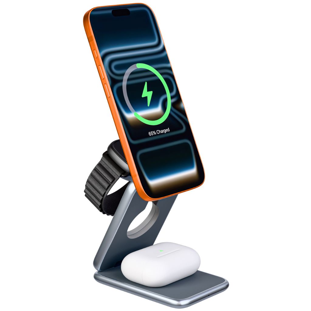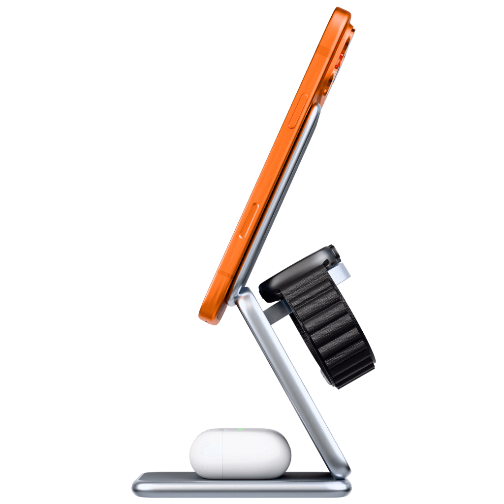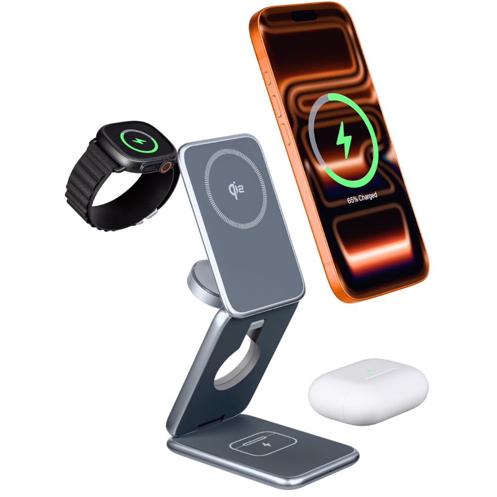 Meet the future of charging — a Qi2-certified foldable station that powers your iPhone, Apple Watch, and AirPods together in one sleek, travel-ready design.