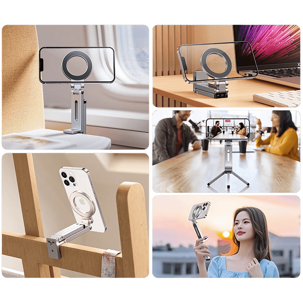 Clamp it, stand it, or hold it—this foldable mount goes from desk to car to plane to luggage in seconds.